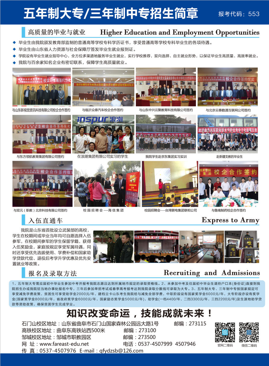 2020年曲阜远东职业技术学院五年制大专/三年制中专招生简章